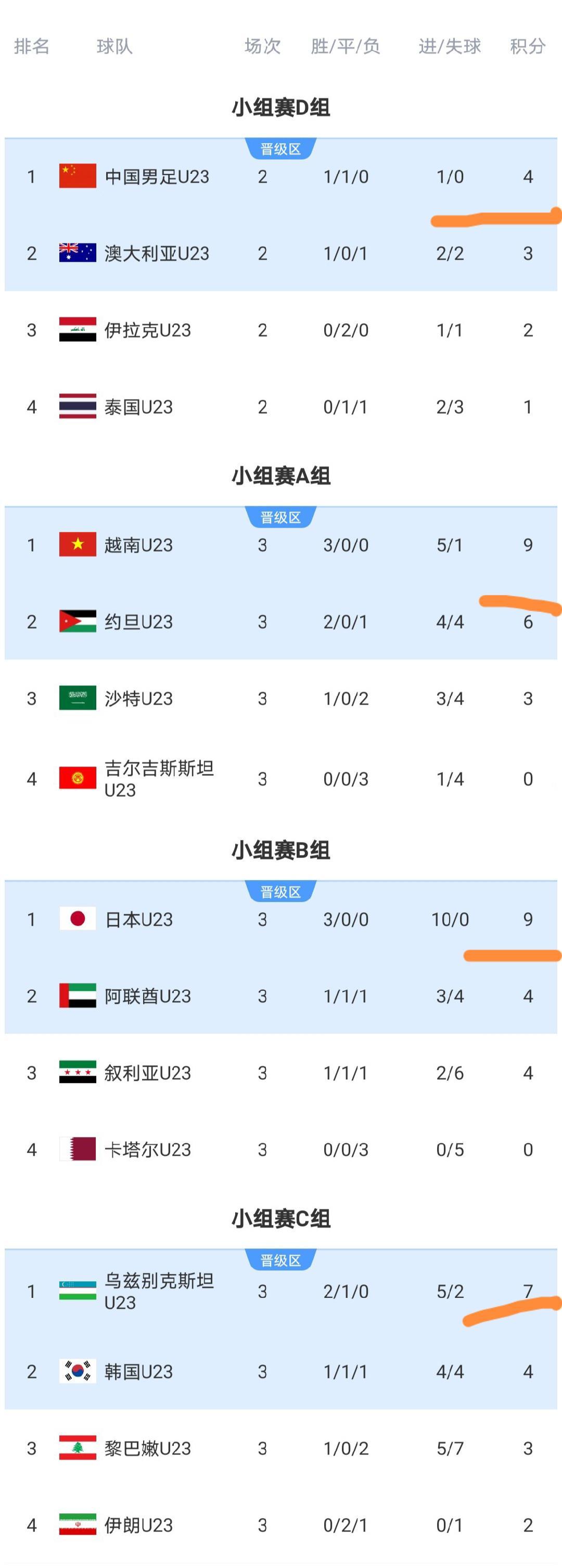 目前就只有D组没有踢完最后一轮,最后的2个八强席位也将在D组,中国队有望斩获小组第一。